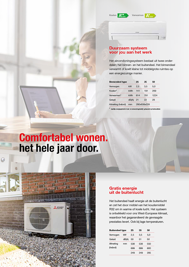 De MSZ-HR-modellen van Mitsubishi Electric behoort tot de stilste airco op de markt. Zeker voor wat betreft een instapmodel airco. De airco unit is voorzien van een soepele, vlakke paneelafwerking en kan door de compacte afmetingen ook boven deuren en ramen worden geplaatst. Met 21dB(A) behoren deze binnendelen tot de stillere airco’s op de markt. Voor de installatie zijn geen ingrijpende bouwkundige aanpassingen nodig.